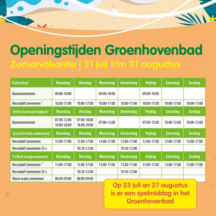 Vanaf zaterdag 19 juli geldt ons zomerrooster voor het Groenhovenbad. Je kunt dagelijks recreatief (vrij) zwemmen van 10:00-17:00 uur in buitenbad, en van 13:00-17:00 uur in de binnenbaden.